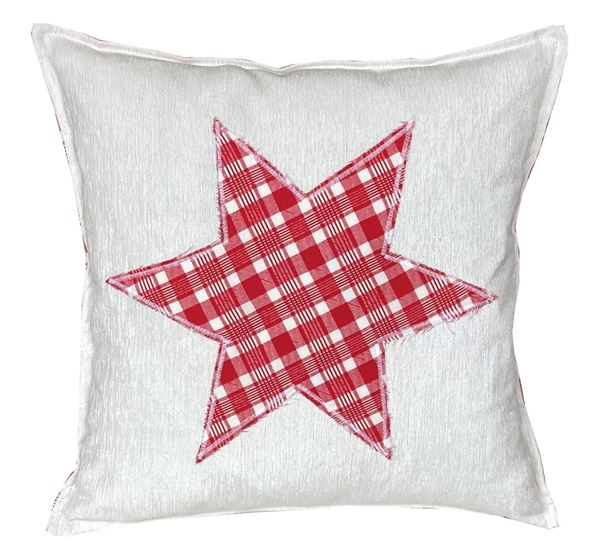 KADİFE ŞÖNİL BEYAZ KOTON KIRMIZI KARELİ YILDIZ FORMU APLİKELİ DEKORATİF YASTIK KILIFI