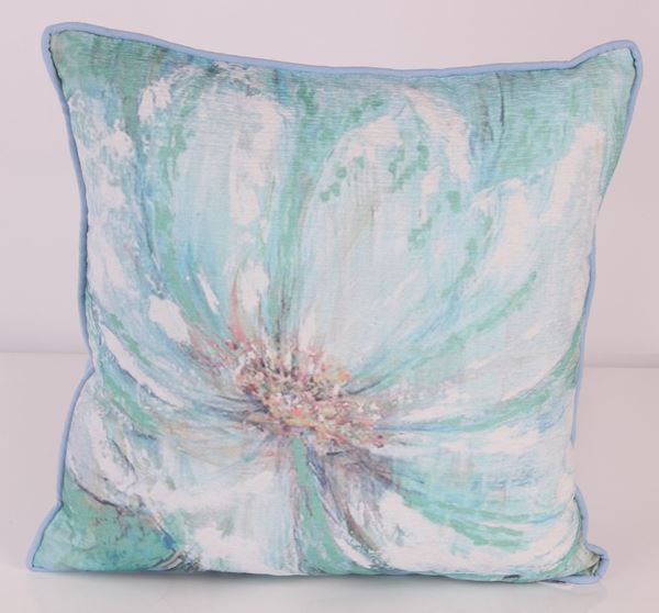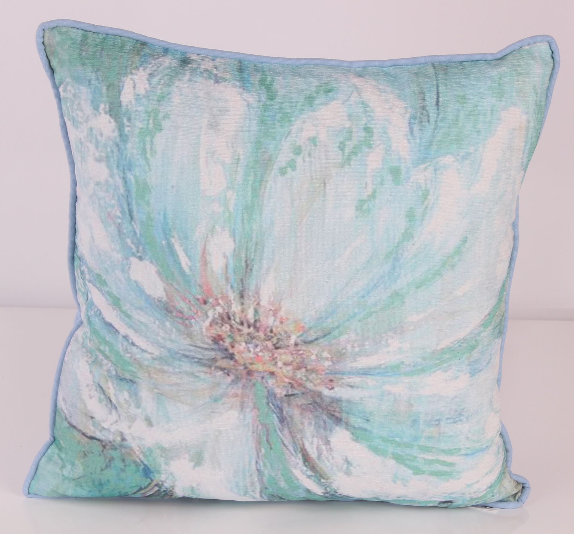 KADİFE ŞÖNİL TURKUAZ BEYAZ ÇİÇEK DESEN BASKI DEKORATİF YASTIK KILIFI